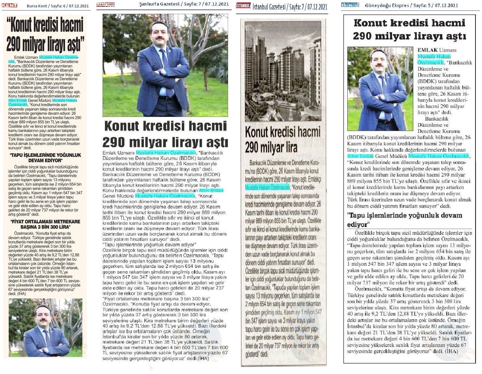 Emlak Uzmanı Mustafa Hakan Özelmacıklı, "Bankacılık Düzenleme ve Denetleme Kurumu (BDDK) tarafından yayımlanan haftalık bültene göre, 26 Kasım itibarıyla konut kredilerinin hacmi 290 milyar lirayı aştı" dedi.